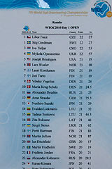 Kao i na Europskom prvenstvu za pojedinačni plasman se zbrajaju rezultati oba dana, a za ekipni samo rezultati drugog dana. Međutim, za razliku od Europskog prvenstva gdje postoje dva odvojena ekipna natjecanja - jedno u Open i jedno u Para kategoriji, na Svjetskom prvenstvu ima samo jedno i svaka se ekipa sastoji iz tri natjecatelja u Open i tri natjecatelja u Para kategoriji, a rezultat ekipe se dobije tako da se zbroje dva bolja rezultata u Open i dva bolja rezultata u Para kategoriji.